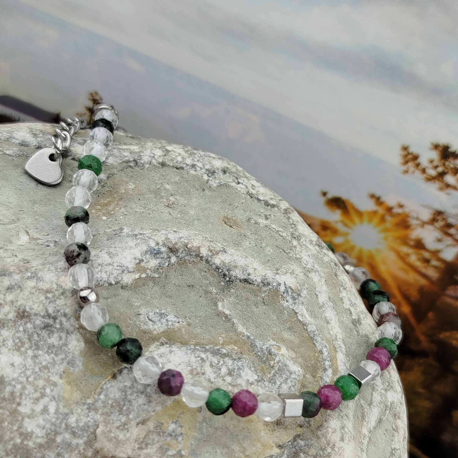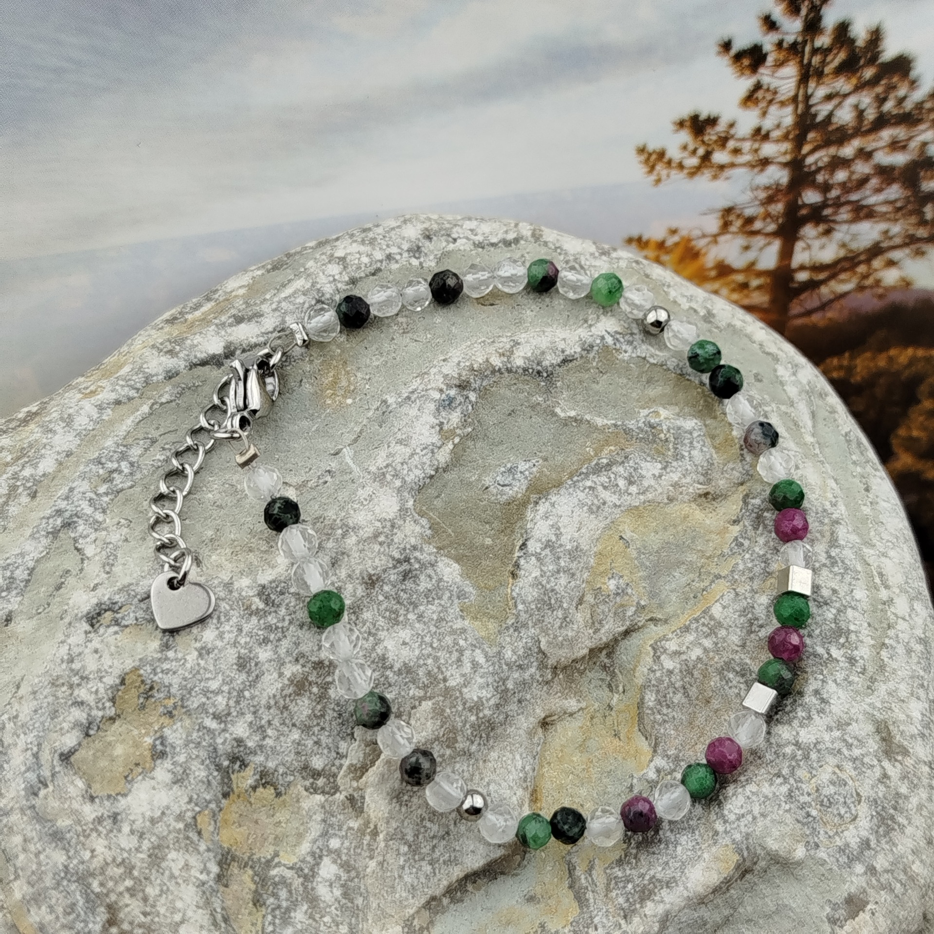 Materiál: Náramek z nerezové oceli 316L a přírodního zoistu, rubínu a křišťálu.